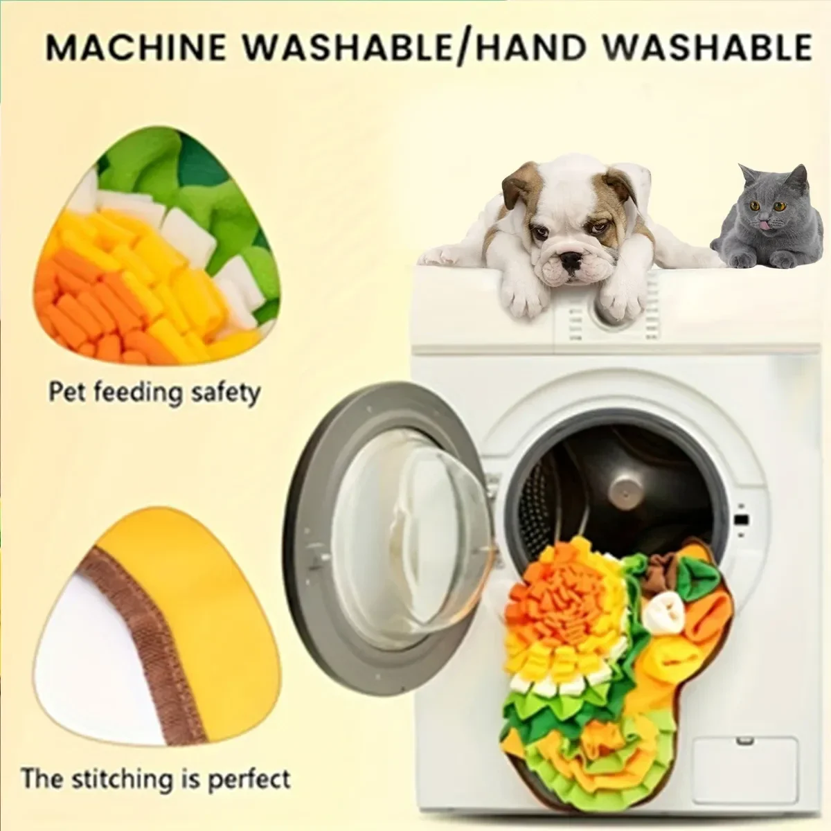 Geef je hond een vrolijke uitdaging met dit speelse zonnebloem snuffelkleed! Het kleed zit vol verschillende verstopplekjes, flapjes en texturen waardoor je hond lekker kan snuffelen, zoeken en ontdekken. Het ingebouwde pieper-element zorgt voor extra prikkel en speelplezier, ideaal tegen verveling en perfect voor dagelijkse mentale stimulatie.